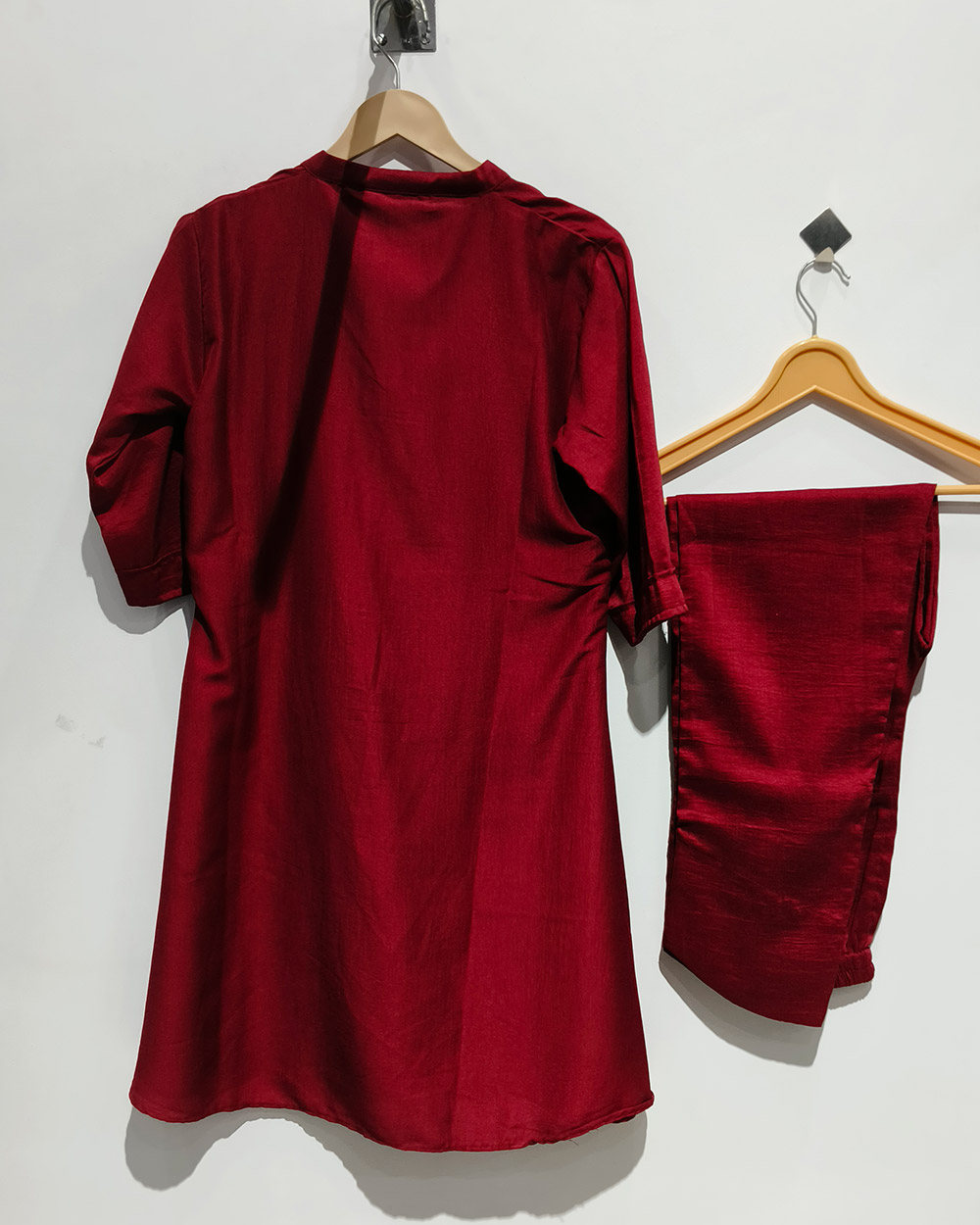 This cord set features a beautifully designed silk kurti in a striking red color, adorned with traditional blue and gold patterns around the neckline, hem, and sleeves. The kurti, crafted from premium silk fabric, offers a luxurious touch and a festive ethnic appeal. The suit is available in sizes ranging from M to 2XL, catering to a wide variety of fits for comfortable and elegant wear. The ensemble is ideal for festive occasions, featuring classic ethnic motifs and a rich color palette. The set is priced at an MRP of 2499 but is currently available at a special selling price of 1290, providing excellent value for quality silk apparel.