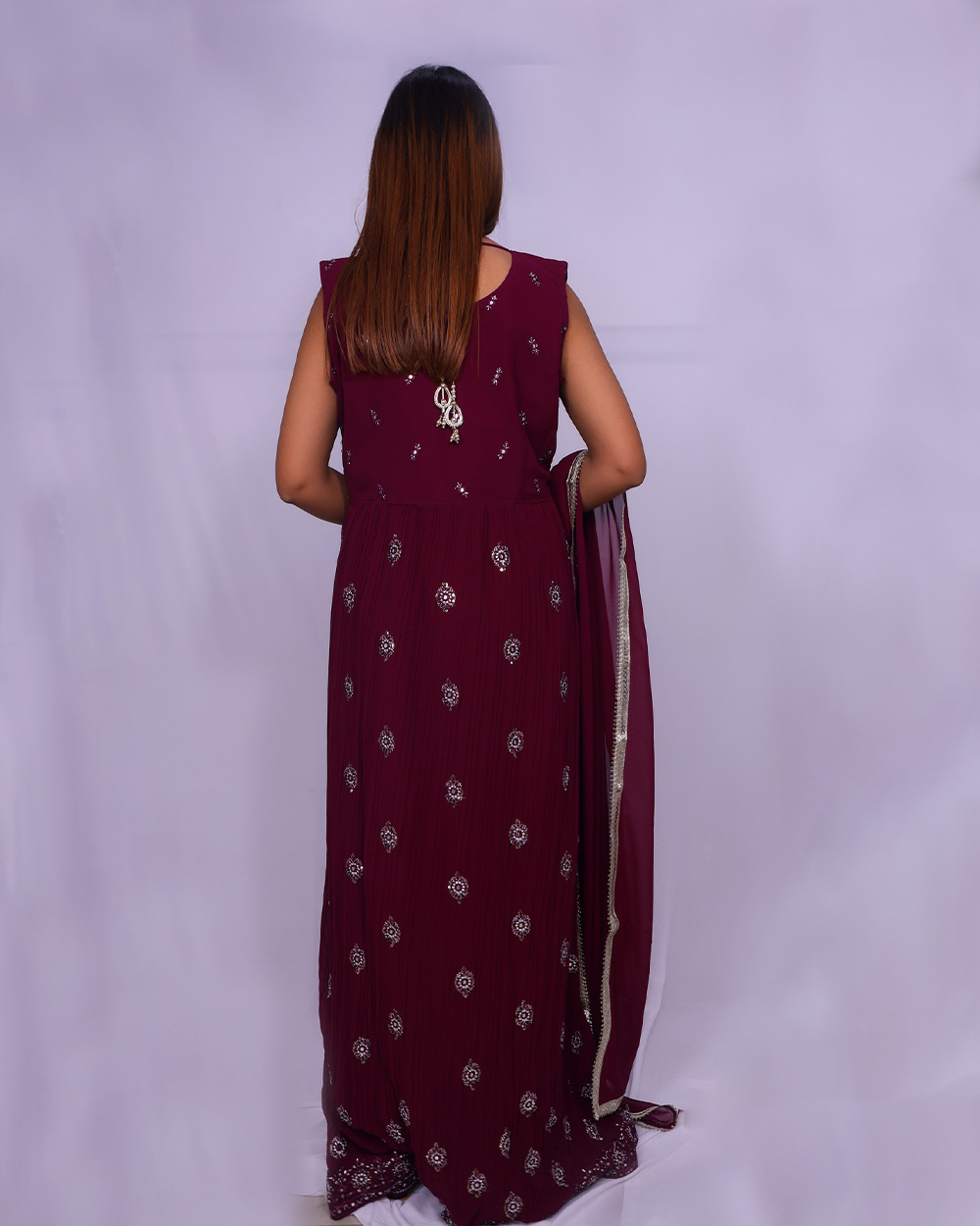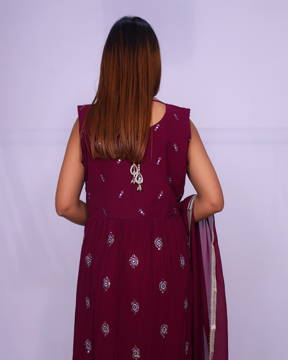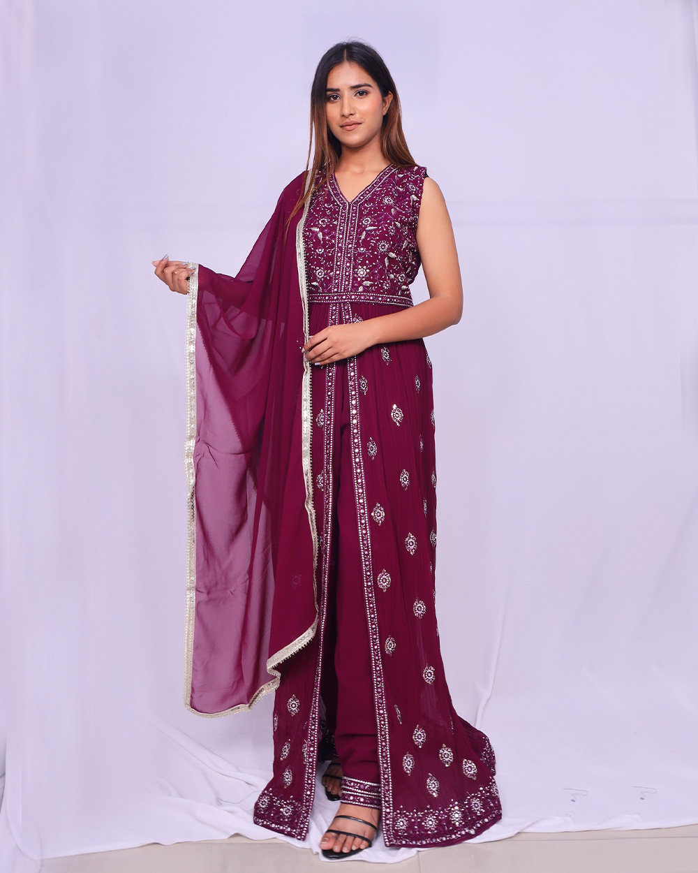 Step into festive elegance with this front-open party wear suit in a rich plum purple hue, blending traditional embroidery with modern design. Perfect for festive gatherings, receptions, or family celebrations.