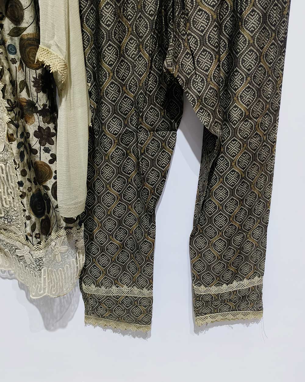 Bottom :Paired with printed modal bottoms featuring lace work at the hem.