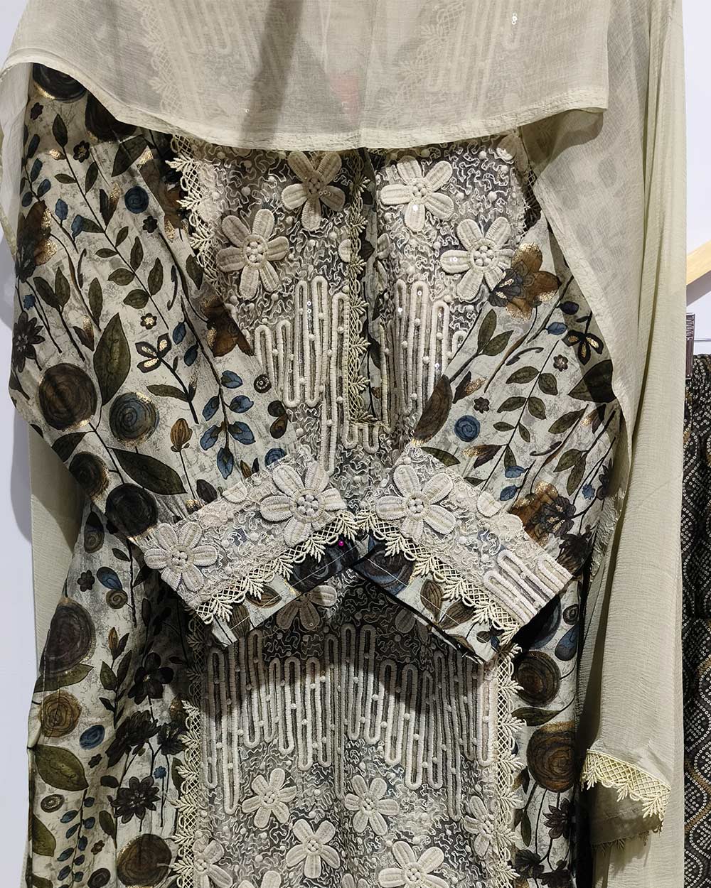 Complemented with a soft chiffon dupatta in matching shade, finished with delicate border.
