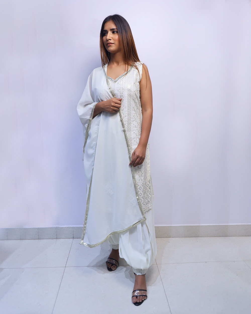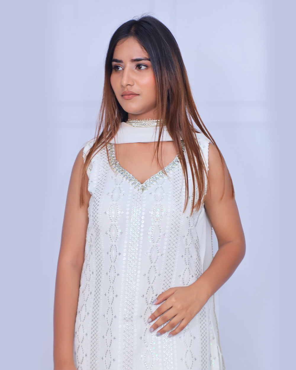 This Farshi Salwar Suit Set beautifully blends traditional elegance with contemporary style. Designed in a soothing light blue shade, it features intricate embroidery and a flowing silhouette — perfect for festive gatherings and formal occasions.