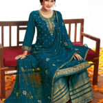 Embrace sophistication with this Latest Designer Salwar Kameez, exclusively from Surat’s top wholesalers. The ensemble is made from premium Pure Muslin Dola Jacquard for both the top and bottom, offering a soft texture with a rich, elegant sheen. The Pure Dupatta, adorned with intricate embroidery work, enhances its luxurious appeal, making it perfect for weddings, festive celebrations, and special occasions.