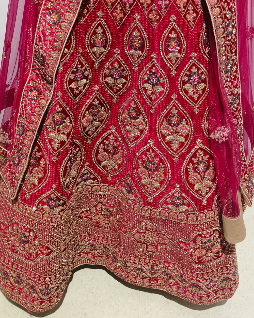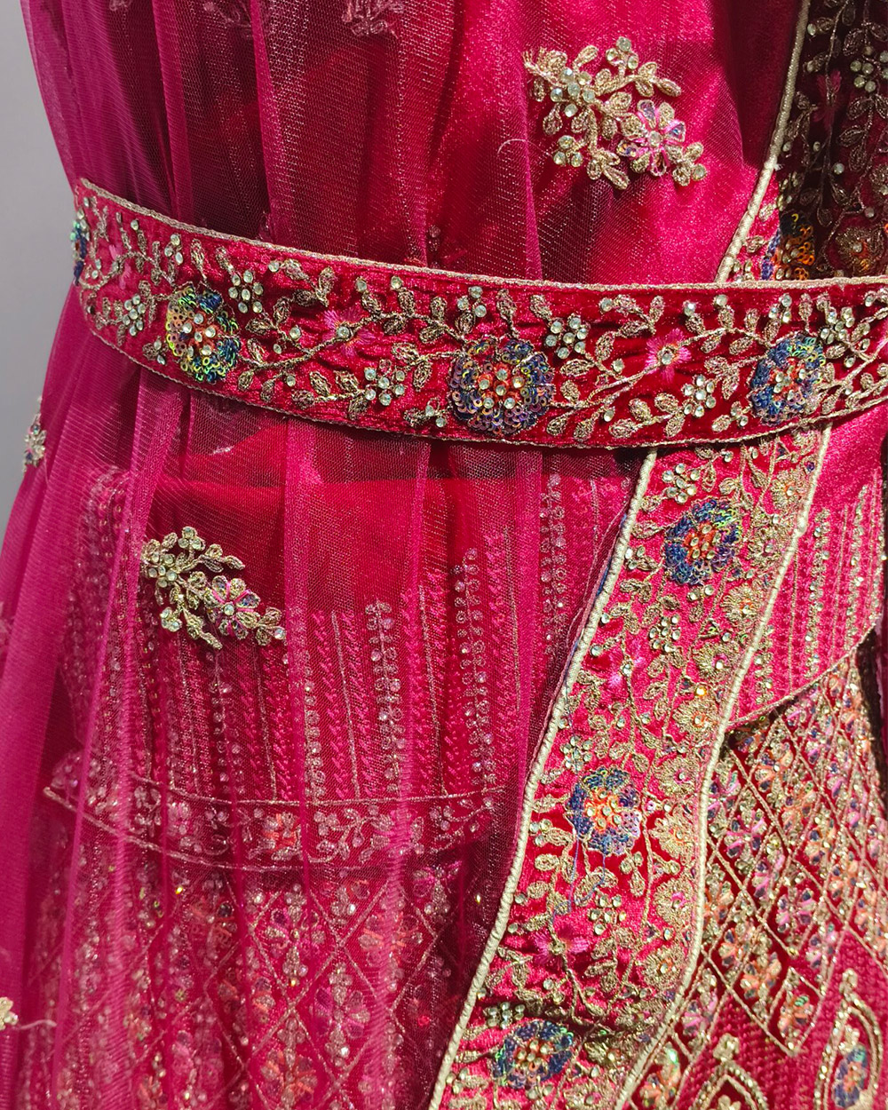 This bridal lehenga features a stunning blend of traditional elegance and intricate craftsmanship. The ensemble consists of a deep red lehenga skirt adorned with elaborate gold embroidery in floral and paisley motifs, giving it a luxurious and regal look. The blouse matches the skirt with heavy embroidery and short sleeves, perfectly complementing the overall design. The lehenga is paired with a net dupatta in a matching shade of red, bordered with intricate embroidery and embellished with delicate patterns, elevating the bridal appearance. The styling is completed with statement jewelry, enhancing the outfit’s traditional grandeur and sophistication.