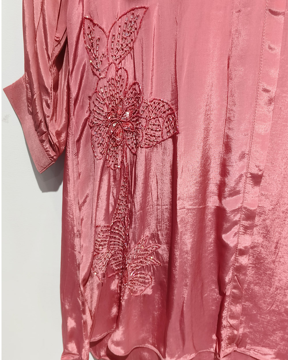 This cord set, crafted from premium imported fabric, features a sophisticated dusty rose pink shade with a smooth, lustrous finish. The shirt is designed with a straight cut and has delicate embroidery on one side, giving it an elegant yet subtle touch. It is paired with matching trousers in the same luxurious fabric.Product DetailsFabric: Imported, providing a glossy texture and soft, comfortable fit.