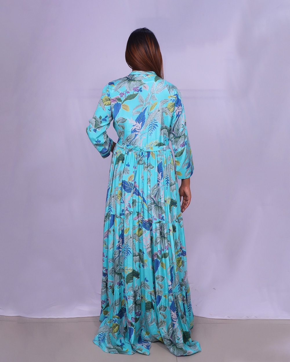 Full-length gown with a graceful silhouette that enhances feminine charm.
