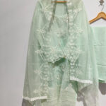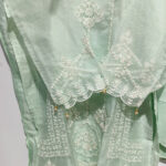 This pastel green embroidered three-piece suit captures effortless elegance and comfort in every detail. The ensemble features a finely embroidered kurta paired with a matching bottom and a graceful net or organza dupatta, beautifully adorned with white floral embroidery and scalloped edges.